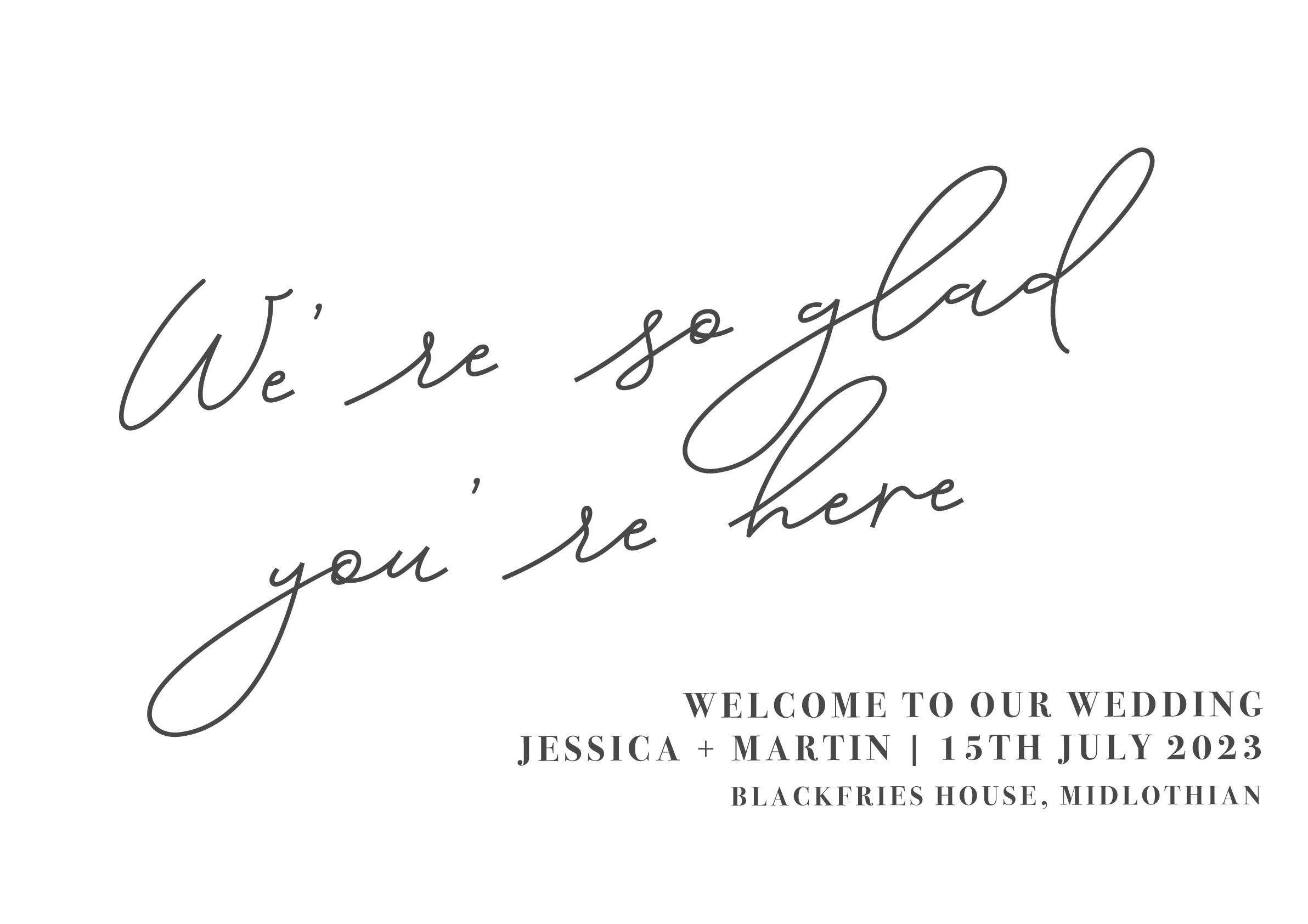 Personalised welcome sign printed on 3mm A1 foamex board. A1 size is approx 59cm x 84cm and is the perfect size to fit on a easel. The personalised welcome signs are customised to your date, venue and names and delivered within 7-10 working days to your home.