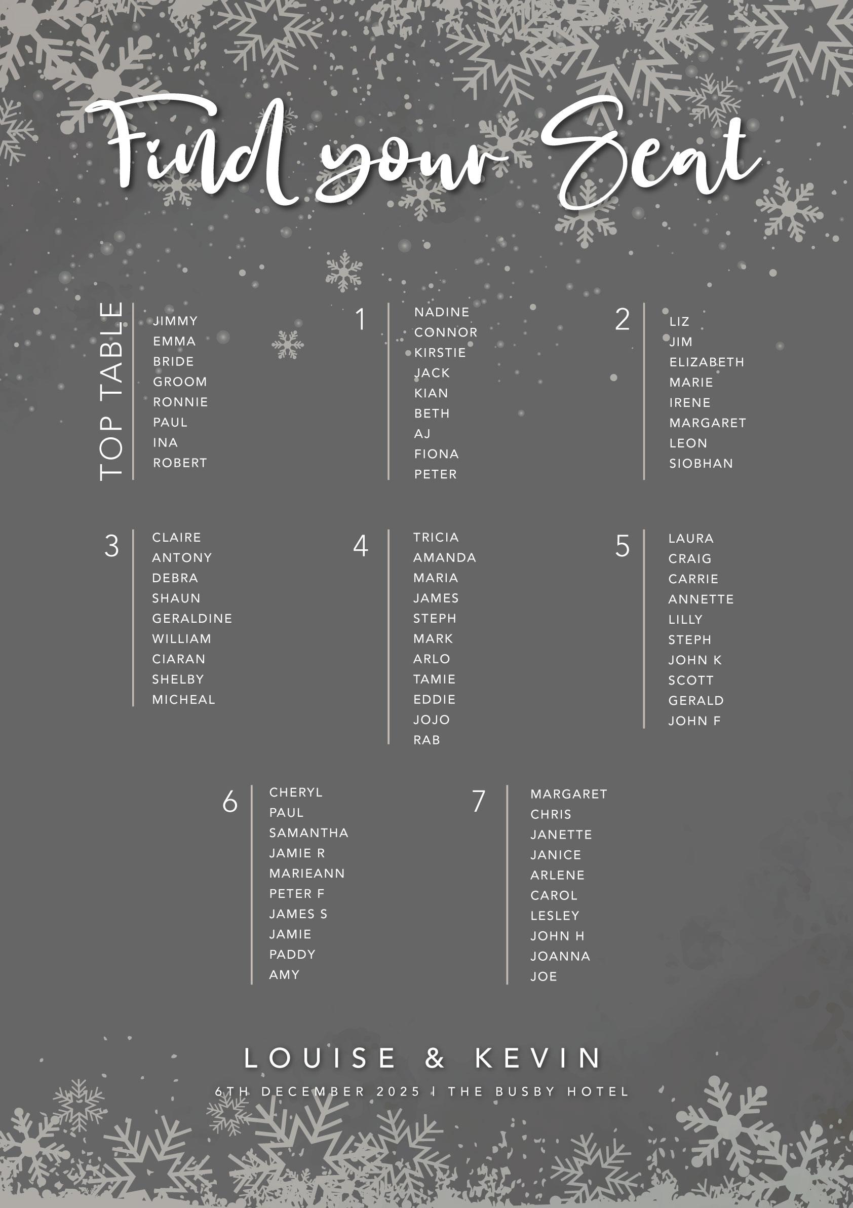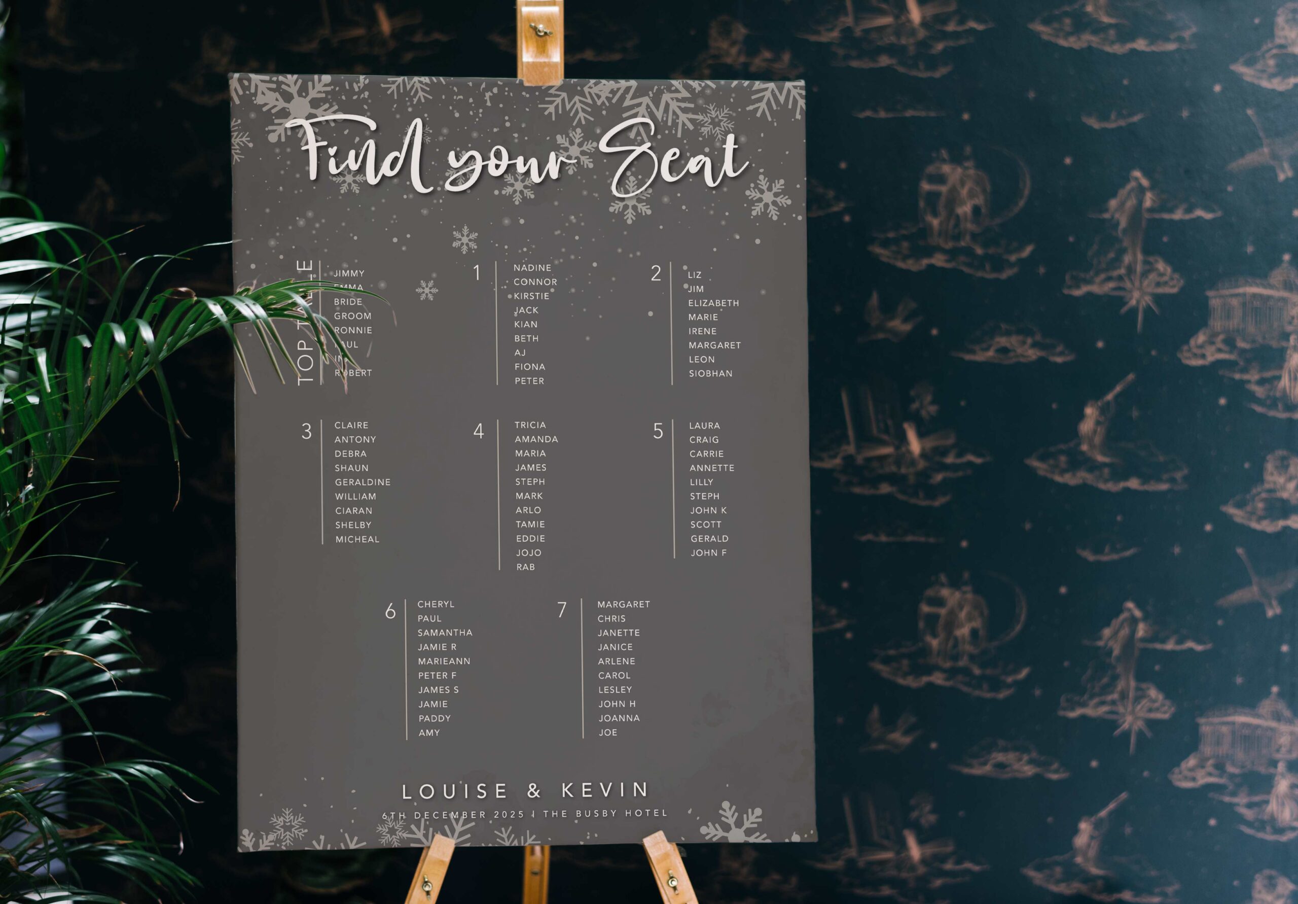 Transform your winter wedding reception with this elegant and enchanting seating plan design. Set against a sophisticated grey backdrop adorned with delicate snowflakes and frosted botanical elements, this table plan creates the perfect first impression for your special day.